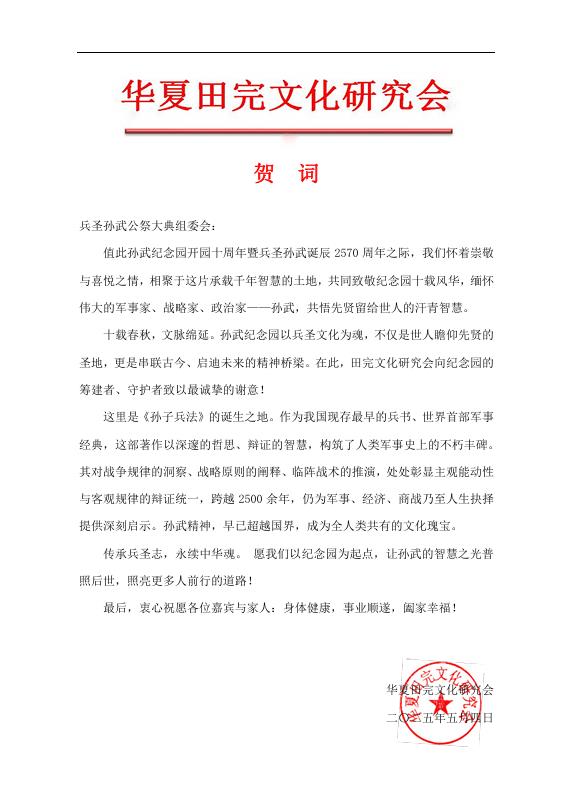 十載春秋,文脈綿延。孫武紀(jì)念園以兵圣文化為魂,不僅是世人瞻仰先賢的圣地,更是串聯(lián)古今、啟迪未來(lái)的精神橋梁。在此,田完文化研究會(huì)向紀(jì)念園的籌建者、守護(hù)者致以最誠(chéng)摯的謝意!