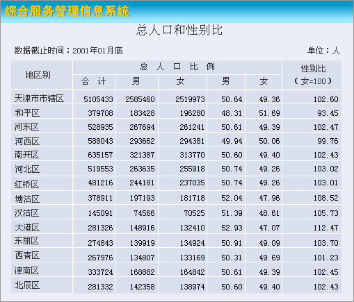 查詢內(nèi)容: 基于人口信息數(shù)據(jù)庫所有字段,向使用者提供庫中數(shù)據(jù)所包括地區(qū)有關(guān)人口總量、結(jié)構(gòu)、分布以及變動情況等的各類統(tǒng)計指標(biāo)。數(shù)據(jù)詳細(xì)程度可以從城市、區(qū)縣、一直到街道一級。最終統(tǒng)計服務(wù)以詳細(xì)的匯總表、統(tǒng)計圖和相關(guān)統(tǒng)計描述報告的形式提交。