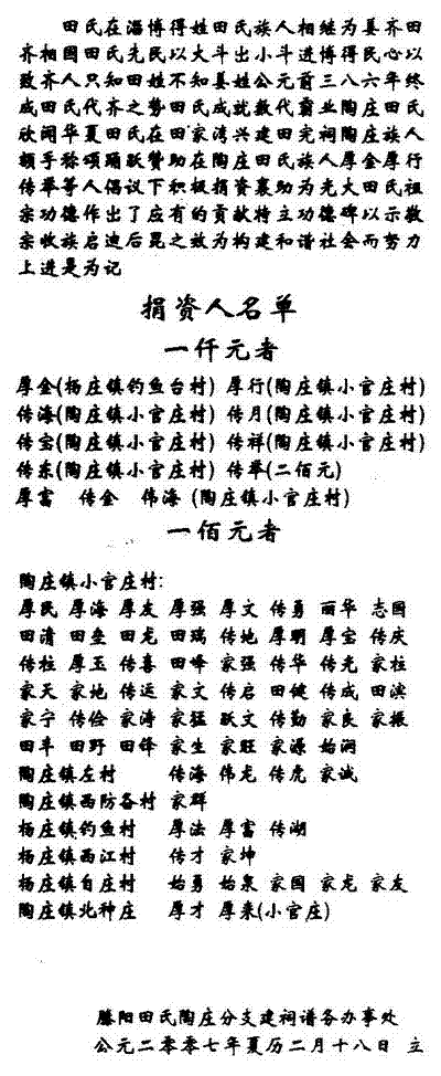 捐資人員名單 1000元:田厚金(楊莊鎮(zhèn)釣魚臺(tái)村)田厚行(陶莊鎮(zhèn)小官莊村) 田傳海(棗莊市公安局) 田傳海(陶莊鎮(zhèn)小官莊村) 田傳月(陶莊鎮(zhèn)小官莊村)田傳寶(陶莊鎮(zhèn)小官莊村) 田傳祥(陶莊鎮(zhèn)小官莊村) 陶莊鎮(zhèn)小官莊 200元:田傳舉 100元:田厚民 田厚海 田厚友 田厚文 田厚強(qiáng) 田厚明 田厚玉 田厚寶 田傳地 田傳慶 田傳柱 田傳勇 田麗華 田志國(guó) 田傳喜 田傳華 田傳光 田傳運(yùn) 田傳成 田傳啟 田傳勤 田傳儉 田耀文 田家寧 田家強(qiáng) 田家柱 田家天 田家地 田家文 田家濤 田家猛 田家良 田家振 田 濱 田 豐 田 野 田 清 田 壘 田 龍 田 瑞 田 峰 田 健 陶莊鎮(zhèn)左村 100元:田傳海 田傳龍 田傳虎 田家誠(chéng) 陶莊鎮(zhèn)西防備村 100元:田家群 楊莊鎮(zhèn)釣魚臺(tái) 100元:田厚法 田厚富 田傳湖 楊莊鎮(zhèn)西江村 100元:田傳才 田家坤 楊莊鎮(zhèn)自莊村 100元:田始勇 田始泉 田家國(guó) 田家龍 田家友 陶莊鎮(zhèn)北種莊 100元:田厚才
