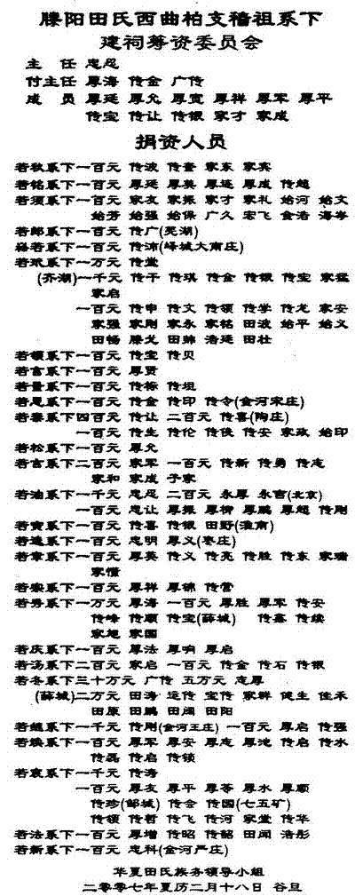 滕陽田氏西曲柏支捐資建祠匯續(xù)族譜名單