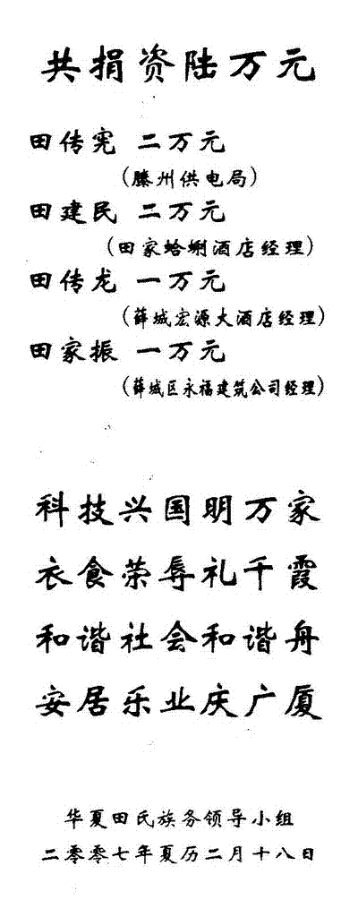 田傳憲(滕州供電局) 捐資二萬元 田建民(田家蛤蜊酒店經(jīng)理) 捐資二萬元 田傳龍(薛城宏源大酒店經(jīng)理) 捐資一萬元 田家振(薛城區(qū)永福建筑公司經(jīng)理) 捐資一萬元 共捐資六萬元