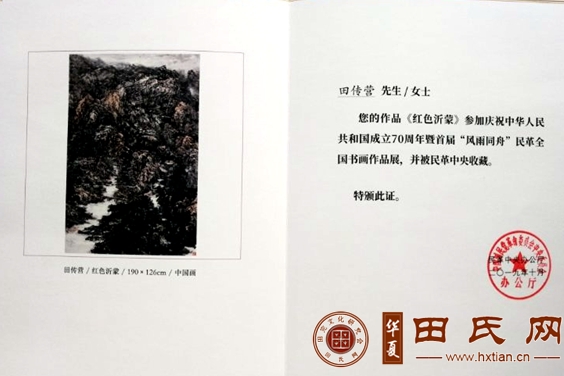 徐淮網(wǎng)訊(記者武家增)由民革中央主辦,民革中央畫報、民革中央企業(yè)家聯(lián)誼會、中山博愛基金會承辦的“慶祝中華人民共和國成立70周年暨首屆風雨同舟民革全國書畫作品展”于2019年9月在北京民族文化宮舉行,中國美術(shù)藝術(shù)家協(xié)會淮海經(jīng)濟區(qū)分會秘書長田傳營參展的《紅色沂蒙》作品被民革中央委員會辦公廳收藏。