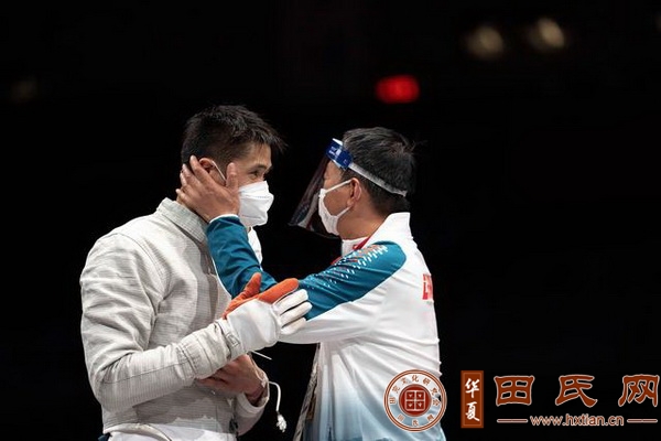 8月25日,田建全(左)在獲勝后與教練慶祝。 當日,在日本千葉縣幕張國際會展中心舉行的東京殘奧會輪椅擊劍男子個人佩劍A級季軍爭奪戰(zhàn)中,中國選手田建全以15比14戰(zhàn)勝烏克蘭選手安德里·杰姆丘克,獲得銅牌。 新華社記者 熊琦 攝