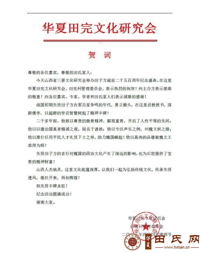 今天山西省三晉文化研究會(huì)舉辦田子方誕辰二千五百周年紀(jì)念盛典。在這里華夏田完文化研究會(huì)、田完祠管理委員會(huì),表示熱烈的祝賀!向主辦方表示崇高的敬意!向各位嘉賓、專家、學(xué)者和田氏家人們表示誠(chéng)摯的感謝!