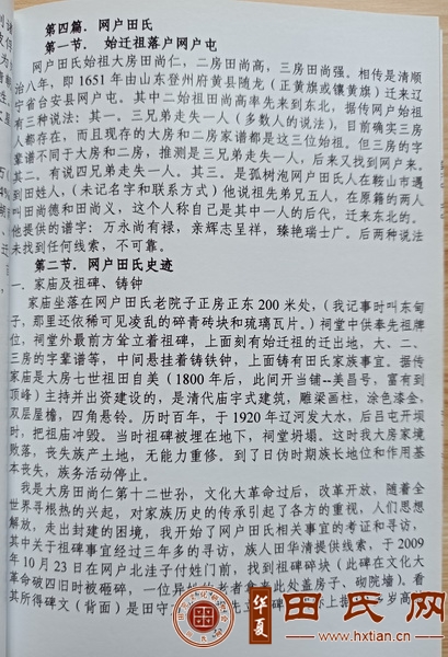《網(wǎng)戶田氏譜志》發(fā)行后的七年多,經(jīng)進(jìn)一步考證和深入研究,我們家族直系傳承脈絡(luò)是:松嵐北支田原勝——三世(田原勝兩個孫子),遷往田家花園(現(xiàn)龍口市七家鎮(zhèn)下田家)——我們的三位始祖(田原勝第七代孫)從田家花園于清順治八年遷到現(xiàn)在的遼寧省臺安縣達(dá)牛鎮(zhèn)網(wǎng)戶村(原清盛京內(nèi)務(wù)府管轄的“網(wǎng)戶”,落戶地名是網(wǎng)戶屯,康熙26年就是城守界標(biāo)志地,遠(yuǎn)近聞名)
