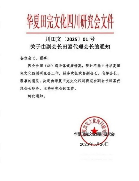 因會長田(遠)鳴身體健康情況,暫時不能主持華夏田完文化四川研究會工作,經(jīng)多次征求各副會長、名譽會長、理事的意見,決定由華夏田完文化四川研究會副會長田嘉代理會長職務(wù),主持研究會的工作。