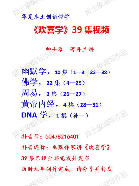 10、集大成之著。最后,這才有了現(xiàn)在的幽默學(xué)、佛學(xué)、周易、黃帝內(nèi)經(jīng)、DNA五大智慧共通之處合力創(chuàng)建的粗坯成形的《歡喜學(xué)》。而這個總時間,約33年。
