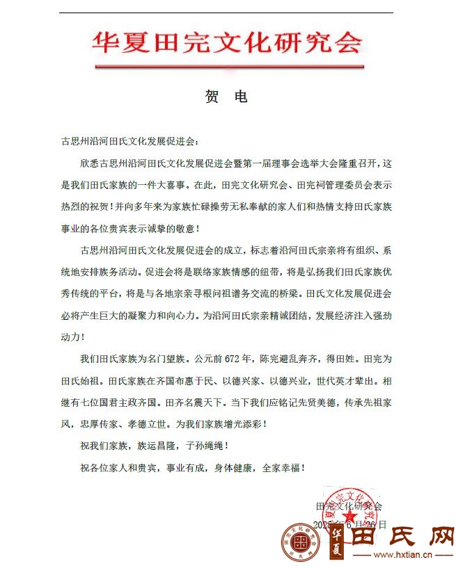 在熱烈的氣氛中,主持人隆重宣讀了湘鄂川渝滇黔等祖國(guó)大西南部分省、市、縣宗親組織和個(gè)人發(fā)來(lái)的賀信、賀電、賀詩(shī)、賀詞,華夏田完文化研究會(huì)也為會(huì)議專門(mén)發(fā)來(lái)了賀電。這些賀信賀電賀詩(shī)詞,無(wú)不飽含著對(duì)古思州故里沿河田氏文化發(fā)展促進(jìn)會(huì)成立的誠(chéng)摯祝福,更寄托了希望通過(guò)這種平臺(tái)加強(qiáng)交流合作、共謀田氏文化傳承發(fā)展的美好愿望。